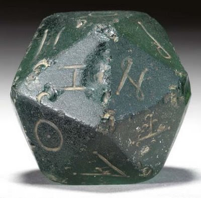 Value: $17,925. Deep blue-green in color, the large twenty-sided die is incised with a distinct symbol on each of its faces.It was the property of a Maryland fine arts professor and were acquired by his father in Egypt in the 1920s.Several polyhedra in various materials with similar symbols are known from the Roman period but the funny thing is that historians have not yet established the game for which these dice were used ! http://www.christies.com/